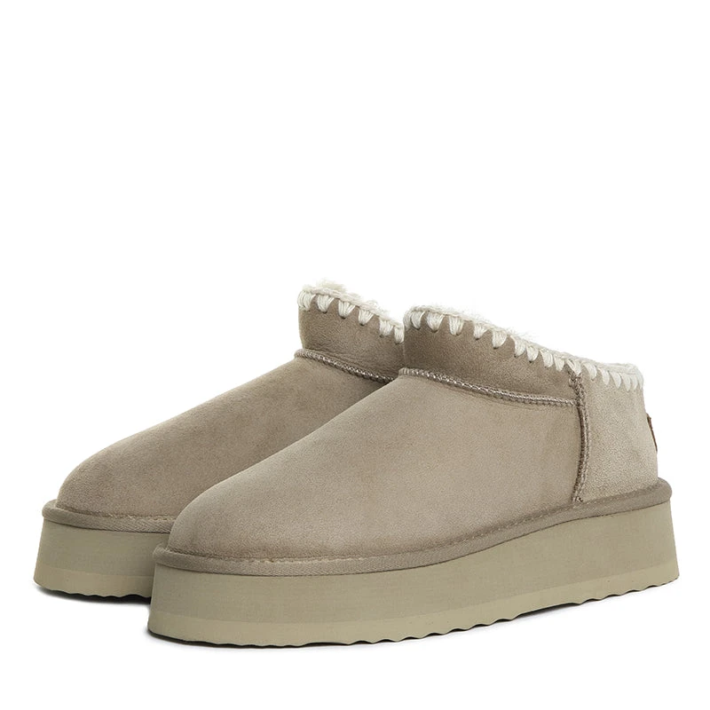 Our iconic UGG Mini Myles Platform Boots are made from suede upper and sheepskin lining, keeping your feet comfortable in both summer and winter due to the insulation in the material. The additional layer of the pretreated suede upper ensures water resistance. Â