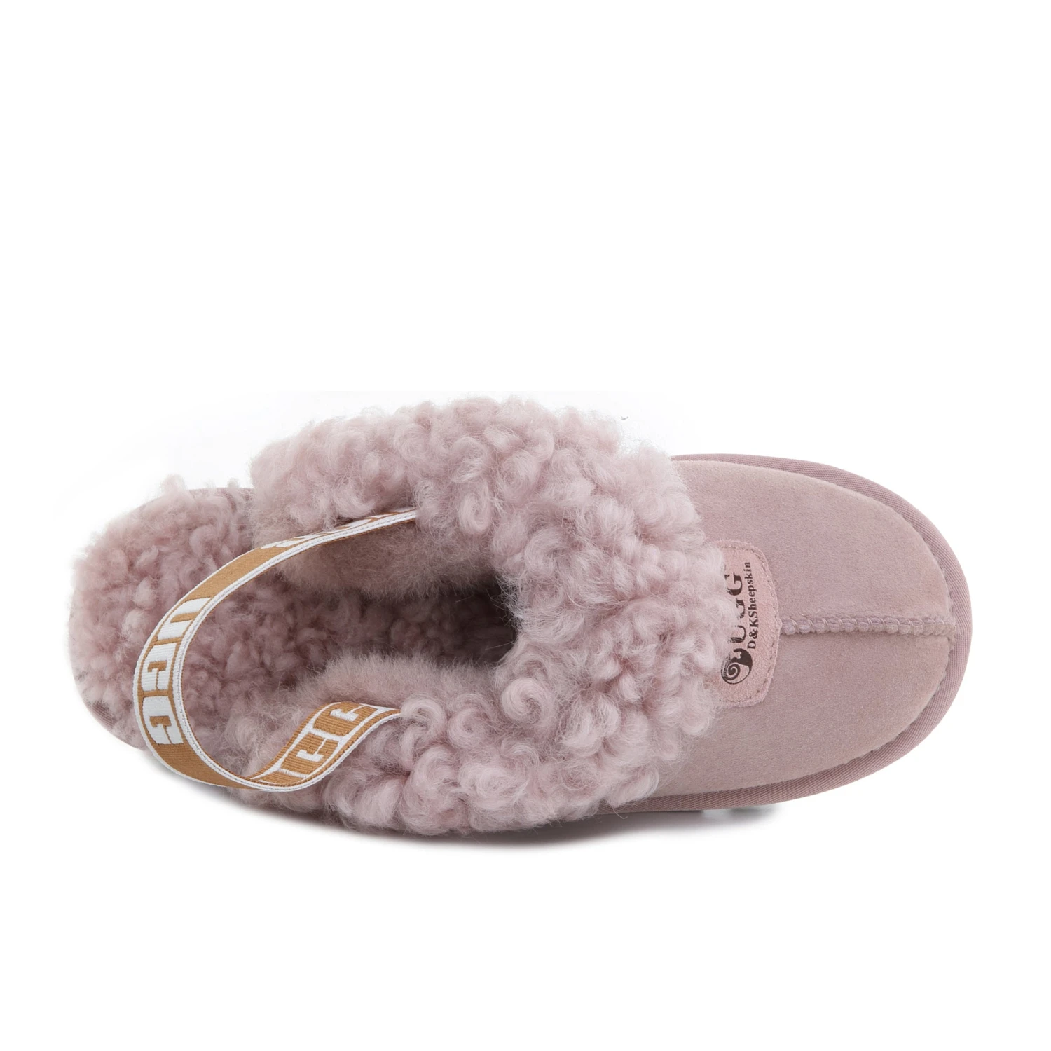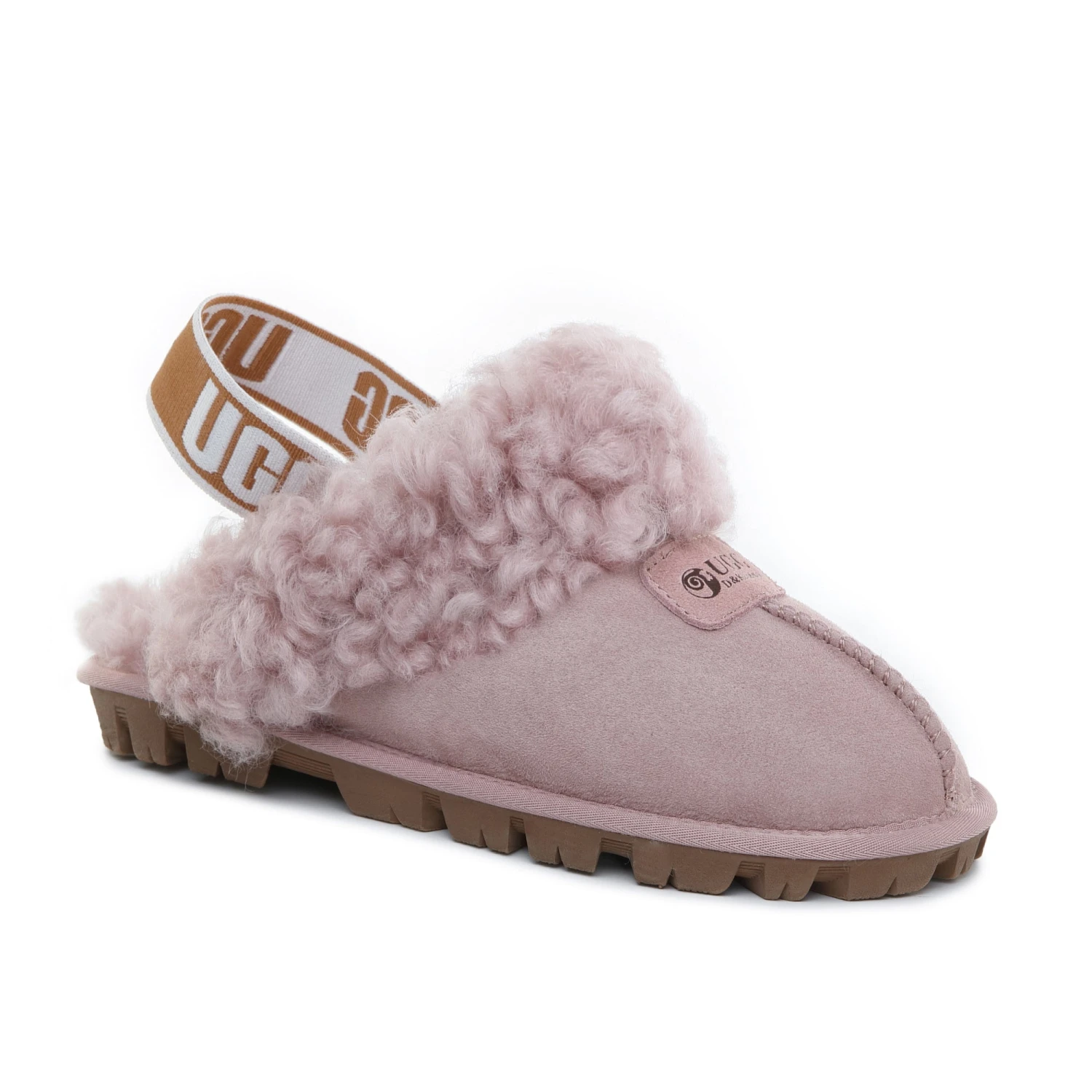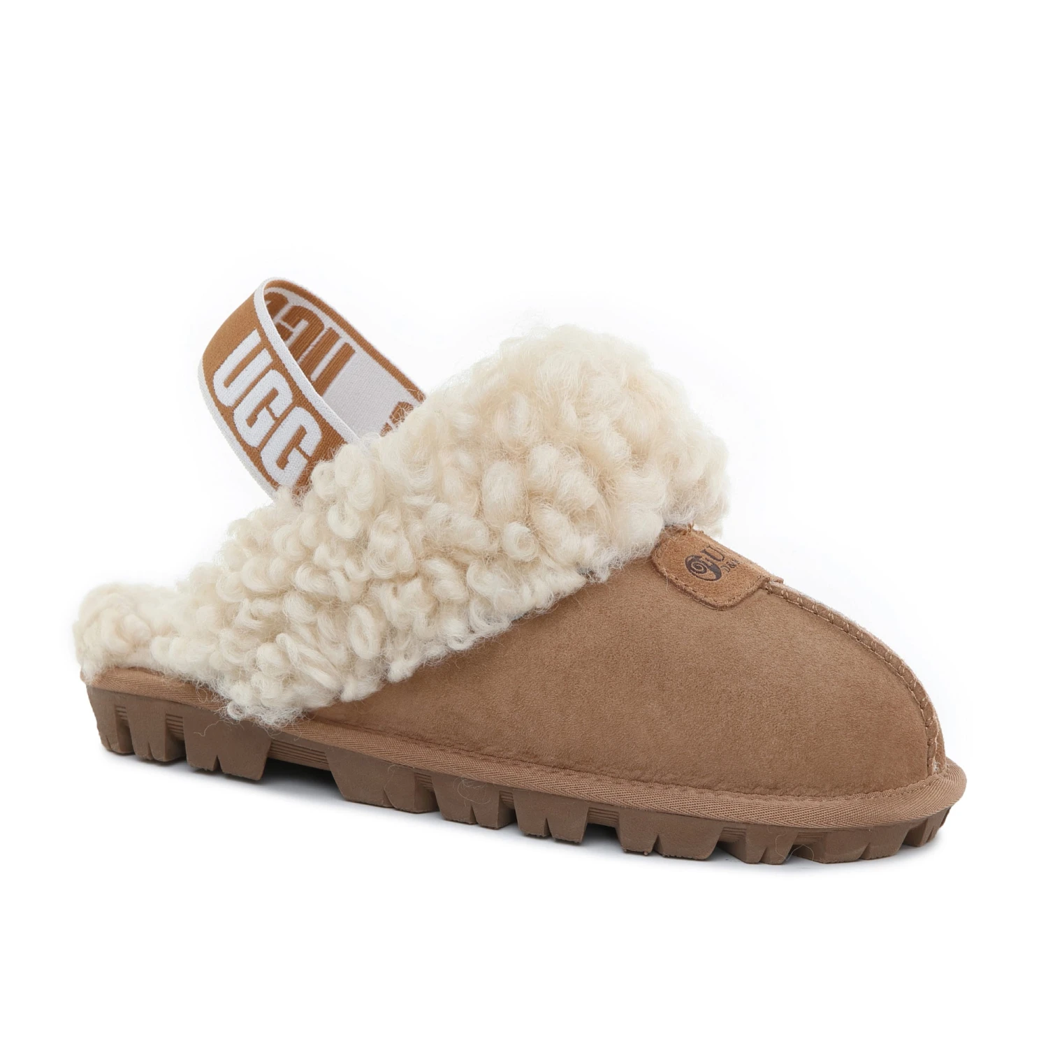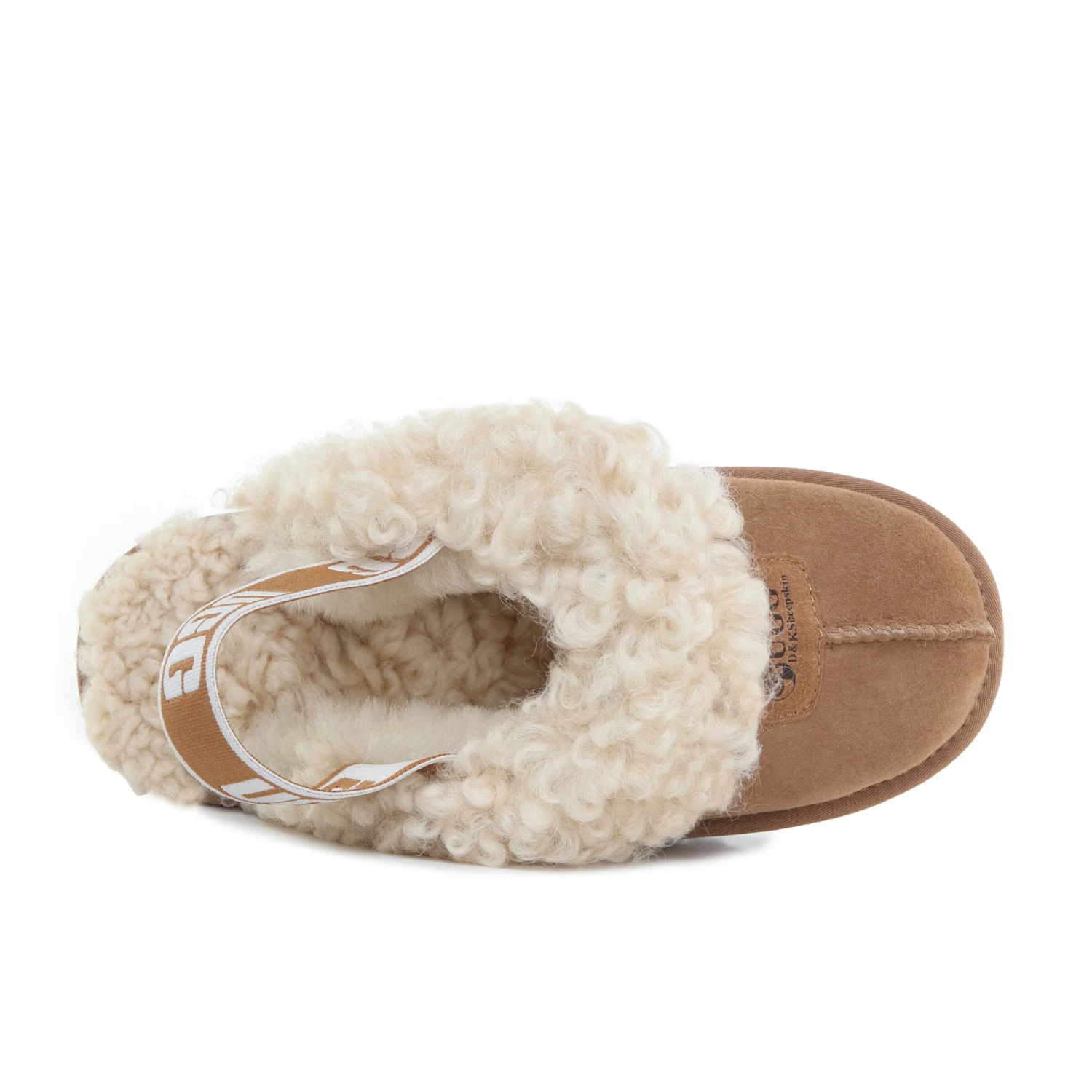 Introducing the new UGG Premium Curly Ladies Scuff! These slippers are made with Australian genuine sheepskin and a water-resistant design. The slingback style enhances breathability during the summer and the branded logo strap provides additional security when out and about. Pairing your outfit with these stylish slippers is sure to turn heads.